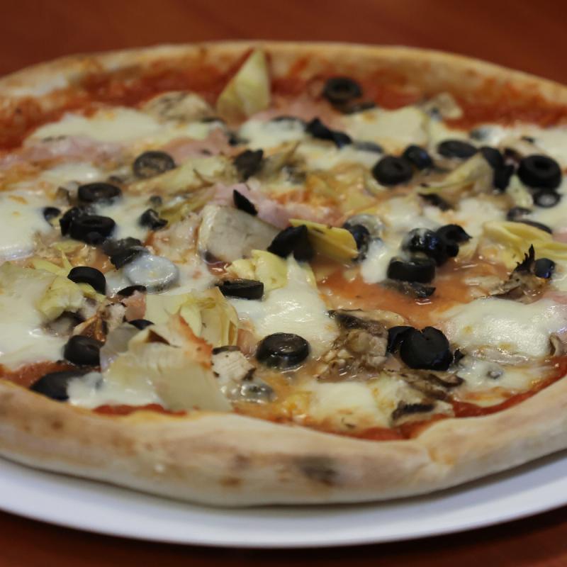 Świeży sos pomidorowy, świeża mozzarella fior di latte, oliwki, pieczarki, szynka włoska gotowana prosciutto cotto, karczochy
